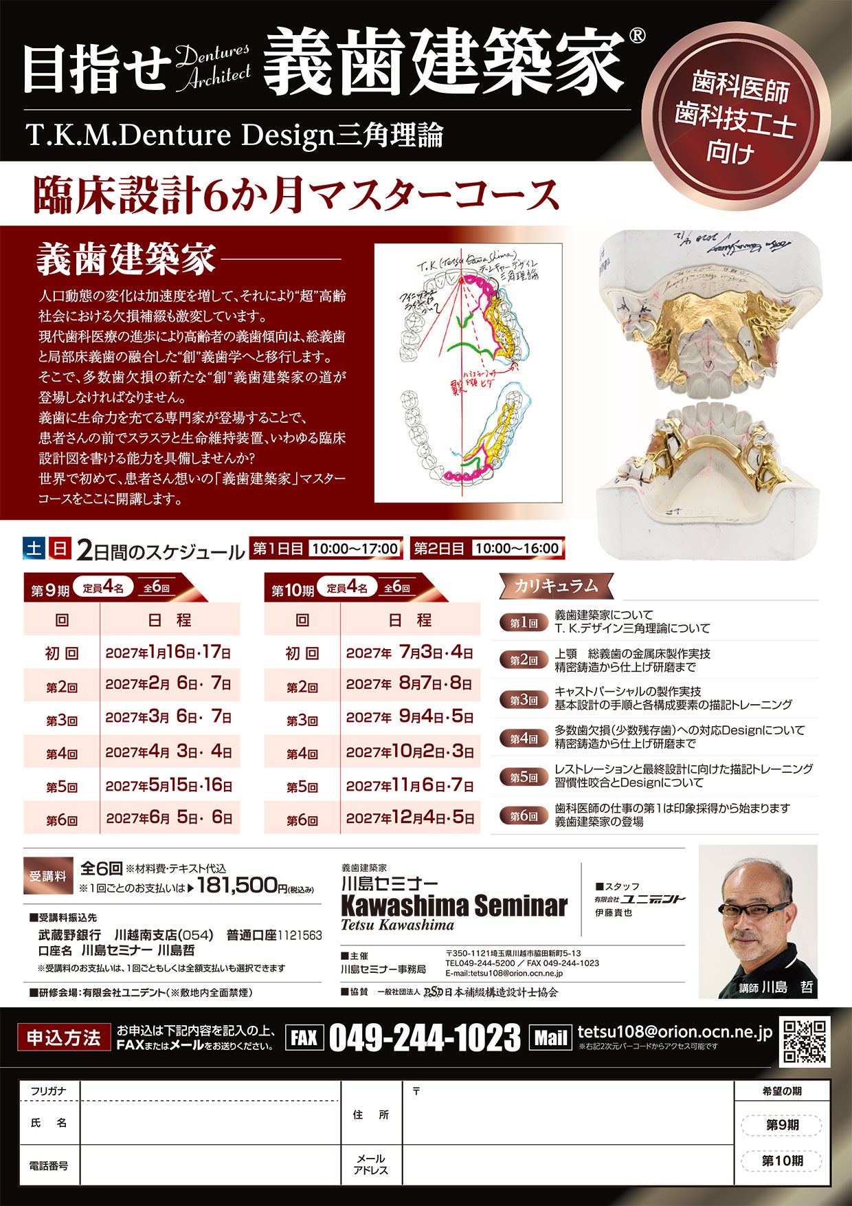 「義歯建築家」の新しい地平を創出しながら、今後共国民歯科医療の貢献と免疫力向上のための究極の装置である義歯、いわゆる生命維持装置製作の更なる充実に向けて臨床開発に邁進申し上げます。